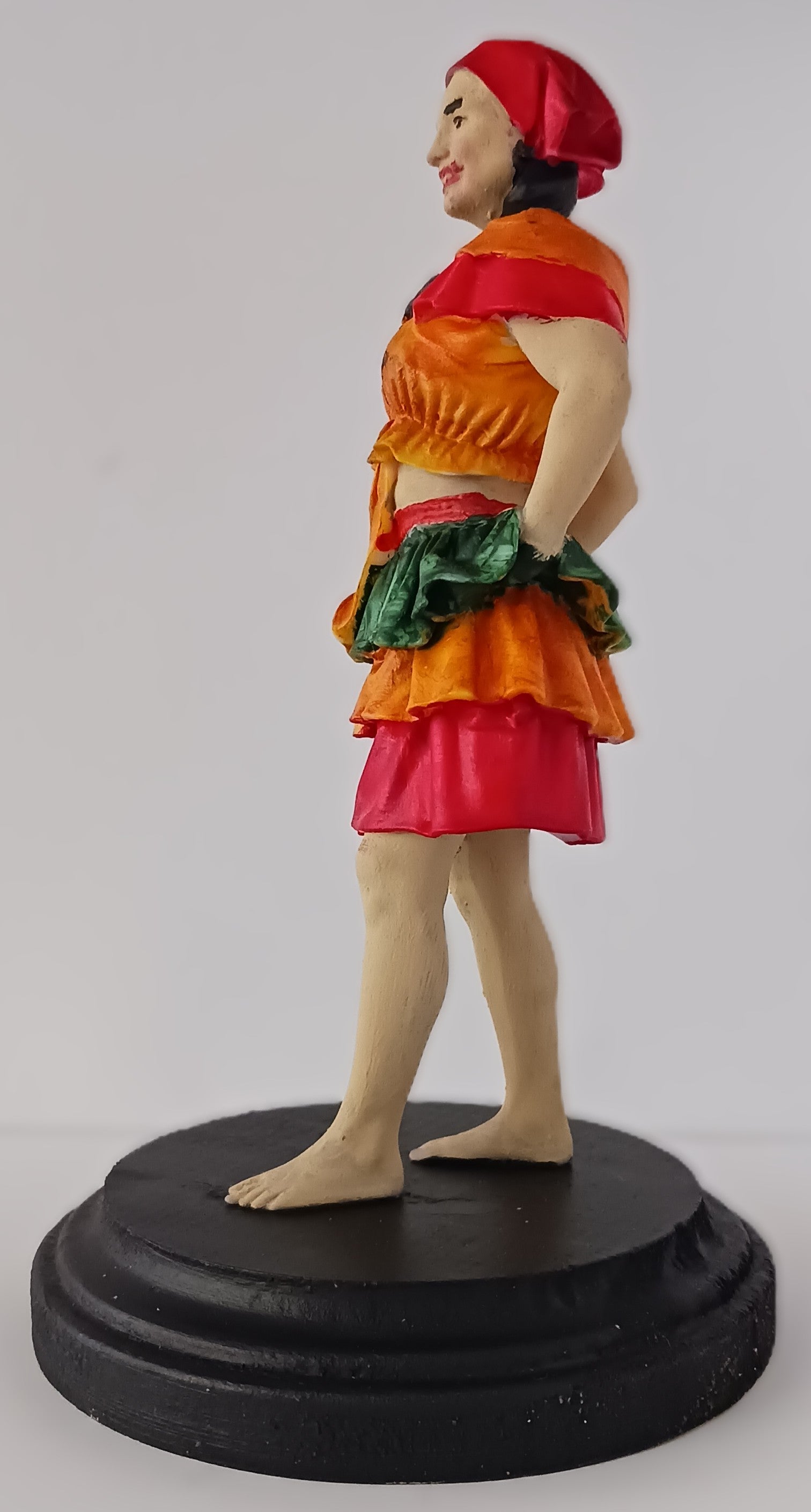 Una exquisita miniatura de una muñeca colombiana que luce el atuendo tradicional de las bailadoras de mapalé en la costa norte colombiana, portando un vestido espectacular digno de la ocasión, impresa en resina.